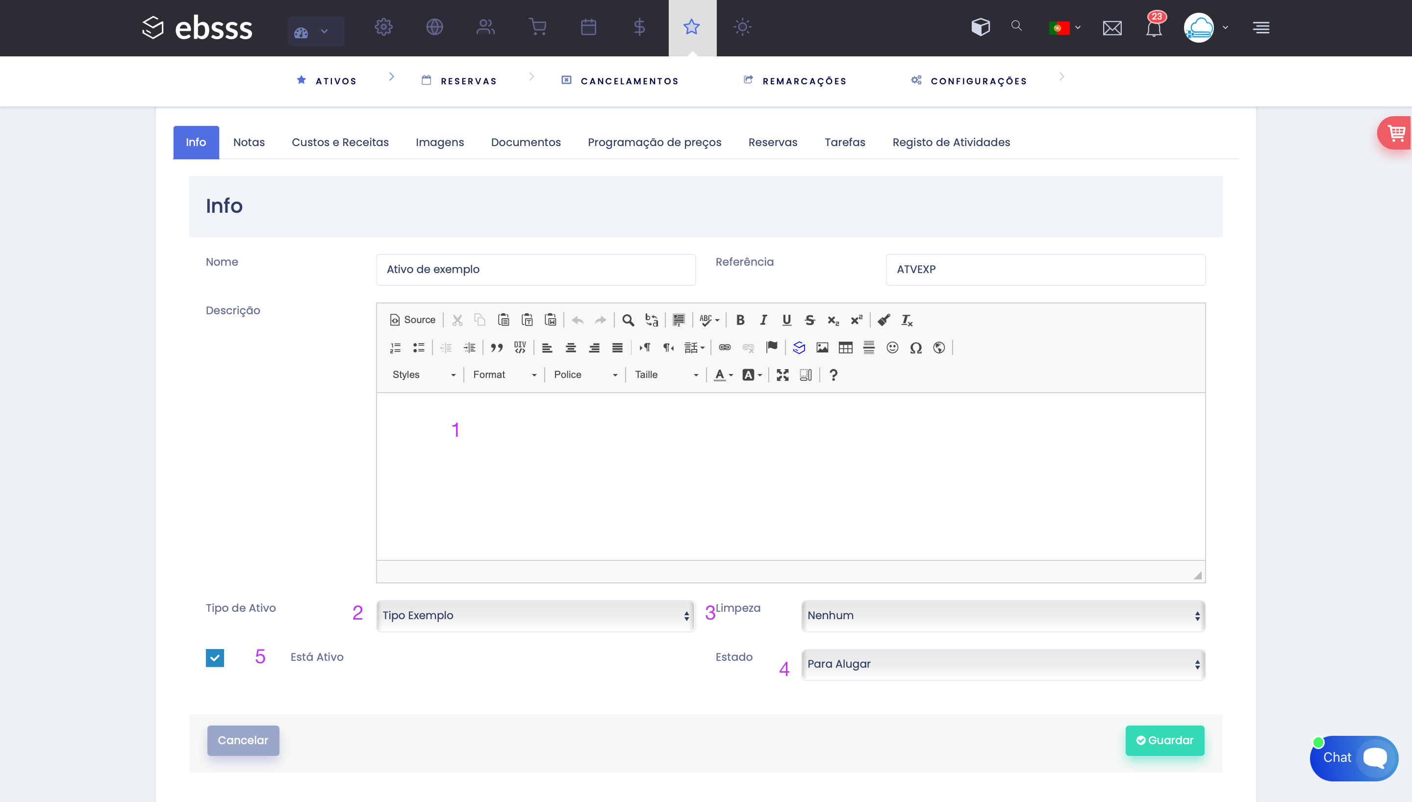 5. Verifique que o checkbox da ativação está marcado, pois se não estiver, o ativo não irá aparecer como disponível e por isso, o aluguer não será possível;