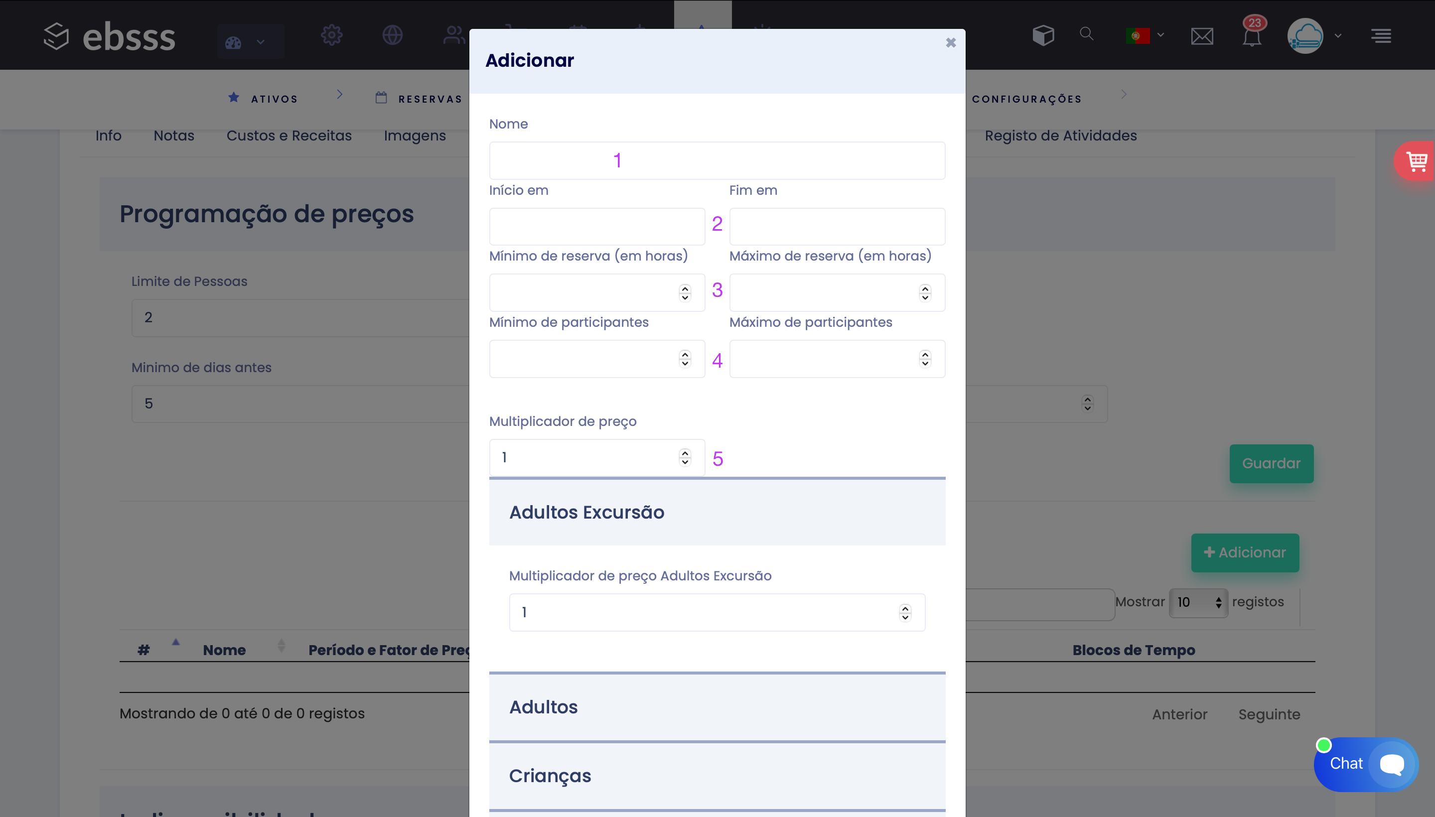 1. Todas estas abas dizem respeito aos Escalões de Preço/Intervalos de Idade. Cada um destes escalões de preço pode ter um multiplicador de preço diferente, o que vai levar a um preço final diferente. Por exemplo, a empresa pode querer cobrar um preço diferente, por dia, dependendo do tempo de carta que possui o cliente. Ao fim-de-semana pretende cobrar 36€ a quem tenha mais de 6 anos de carta e 39€ a quem tenha carta há menos de 6 anos. Poderia criar um escalão de preço ‘’6 ou mais anos de carta’’ e outro ‘’menos de 6 anos de carta’’ (estas opções iriam aparecer onde, no print, aparecem ‘’adultos, crianças….’’). Aí, no multiplicador de preço da primeira opção colocaria 1.2, e no da segunda opção colocaria 1.3;